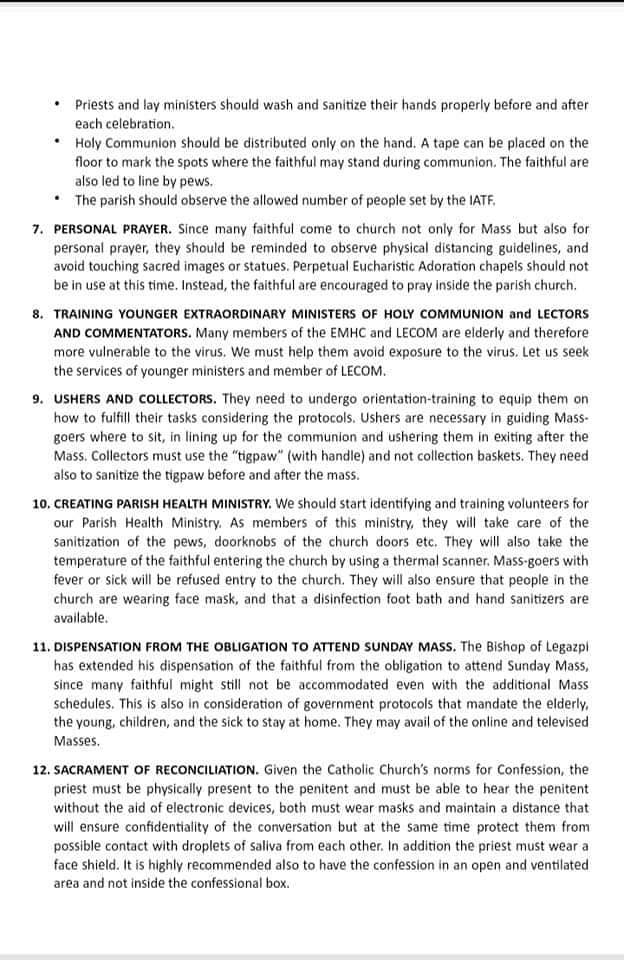 He however said no Sunday and Saturday anticipated Masses will be held yet in most parishes in the Legazpi, Albay and Daraga area because of the continued threat of COVID-19.