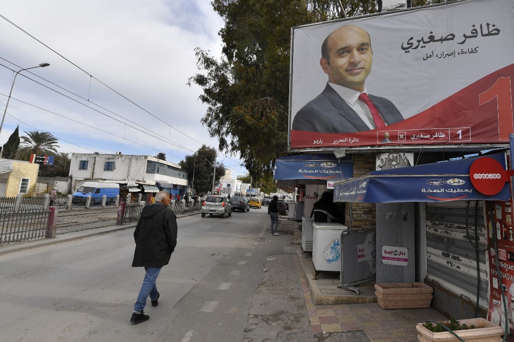 A man walks past an electoral billboard, bearing a portrait of candidate Zafer Saghiri, ahead of the Tunisian national election scheduled for January 29, in Tunisia's capital Tunis, on January 25, 2023. FETHI BELAID / AFP
