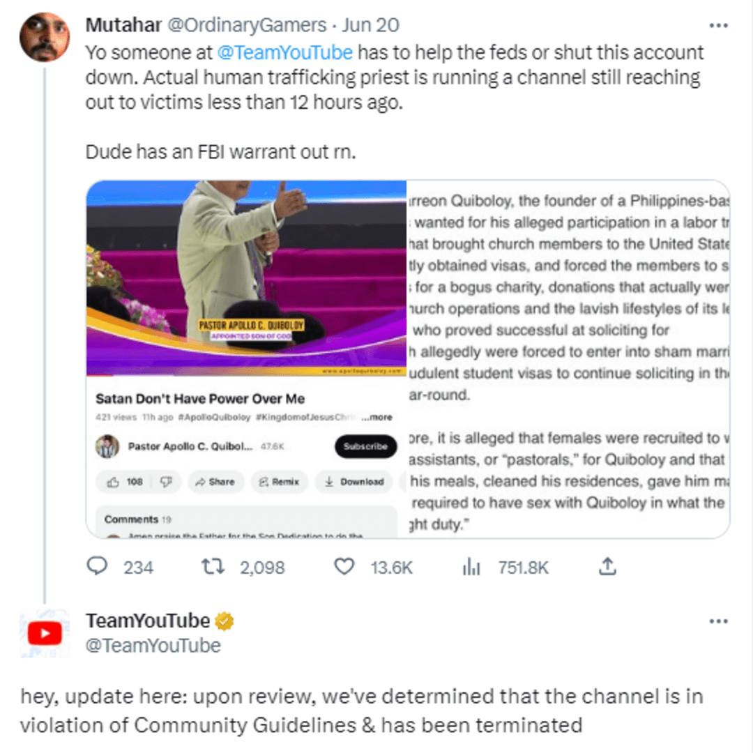 The termination of Quiboloy's channel was brought to light by online influencer @ordinarygamers, who tweeted to YouTube's official Twitter account, urging them to take action against the religious leader. @ordinarygamers specifically mentioned that Quiboloy is wanted by the Federal Bureau of Investigation (FBI) for charges related to fraud and human trafficking.