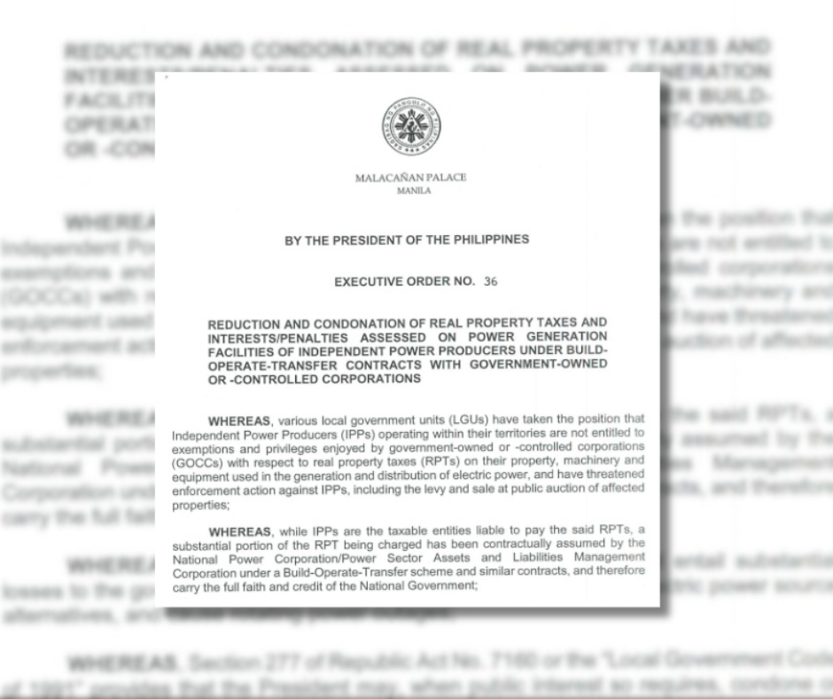 Executive Order (EO) No. 36, signed by Executive Secretary Lucas Bersamin on behalf of the President, reduces and condones real property taxes (RPTs) assessed by local government units (LGUs) on the power generating facilities of IPPs. The EO addresses the concerns raised by various LGUs, which questioned the exemptions and privileges granted to IPPs in terms of real property taxes on their machinery and equipment used for electricity generation and distribution.