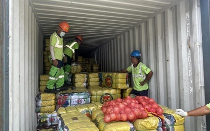 INTERCEPTED. Customs officers find smuggled onions in a container of used clothing at the Port of Manila on Dec. 23, 2022. The Bureau of Customs on Wednesday (Jan. 4, 2023) said it has seized PHP17 million worth of smuggled onions concealed in three containers after a 100 percent physical examination. (Photo courtesy of BOC)