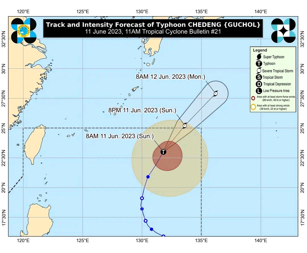 As of 10:00 AM, the center of Typhoon Chedeng was estimated to be approximately 1,100 kilometers east-northeast of Extreme Northern Luzon, with coordinates 23.5°N and 132.1°E. The typhoon has maximum sustained winds near the center reaching 120 km/h, gustiness of up to 150 km/h, and a central pressure of 975 hPa. Chedeng is currently moving north-northeastward at a speed of 25 km/h.