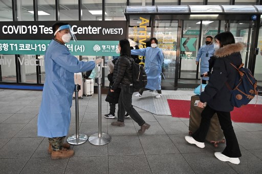 Health workers guide travellers arriving from China in front of a Covid-19 testing centre at Incheon International Airport, west of Seoul on January 3, 2023. Around a dozen countries have slapped fresh travel regulations on travellers from China, as the world's most populous nation faces a surge in Covid cases following its decision to relax strict virus restrictions.
