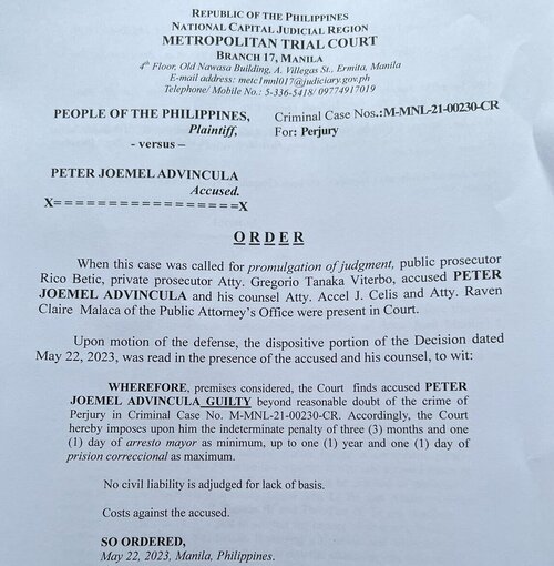 Peter Joemel "Bikoy" Advincula, the whistleblower who made allegations against three lawyers in 2019, has been pronounced guilty of perjury by the Manila Metropolitan Trial Court (MTC) Branch 17.