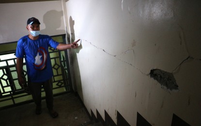 MAJOR DAMAGE. A worker from the Davao de Oro Provincial Hospital (DDOPH) in Montevista town shows the cracks on a health facility caused by the magnitude 6 earthquake on Feb. 1, 2023. Two areas in the hospital were temporarily declared unsafe. (PNA photo by Robinson Niñal Jr.)