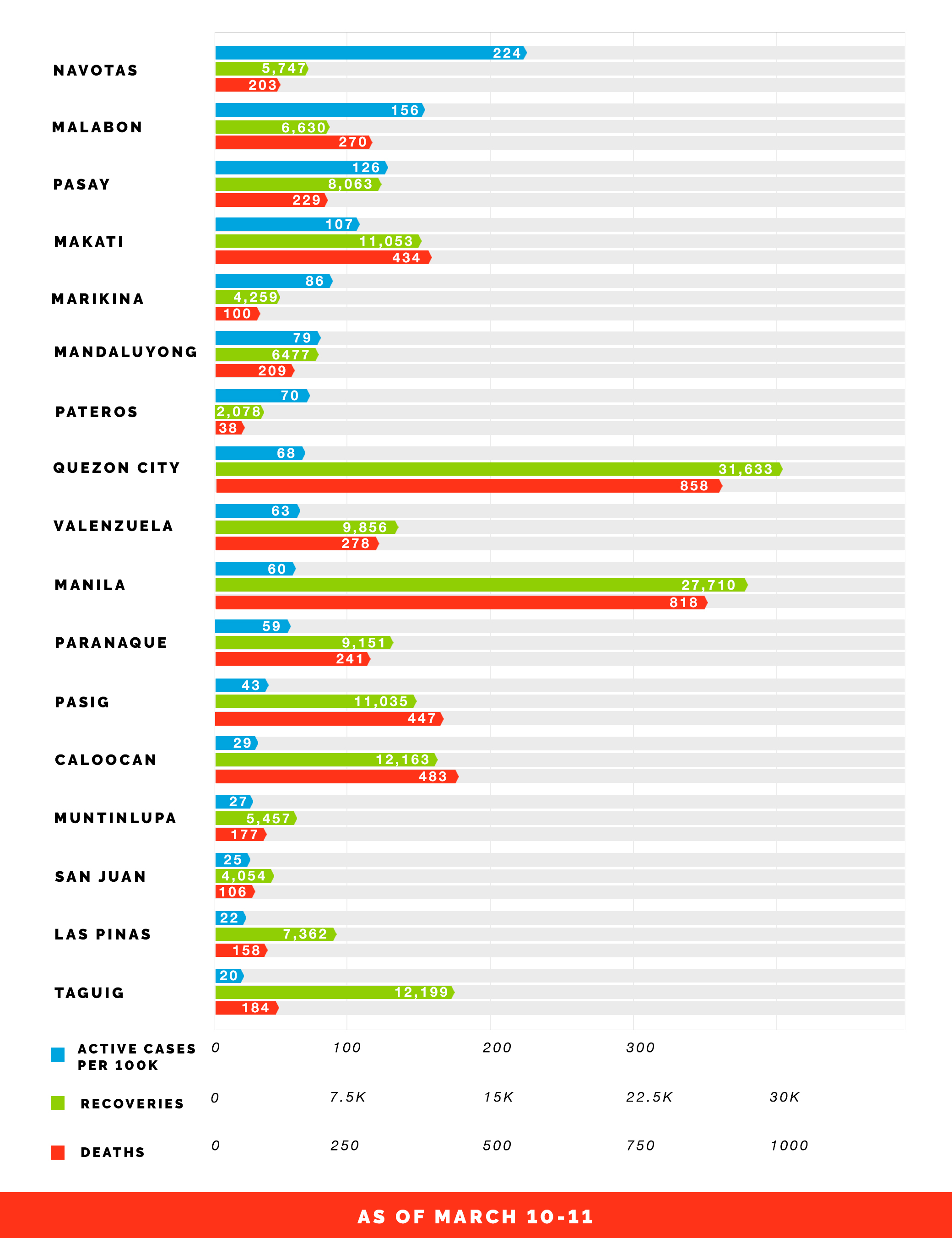 One is the tabulated active cases. Just this March 10, Taguig logged the lowest active case rate among Metro Manila cities with 20 cases for every 100,000 in a population. Navotas was the highest with 224.