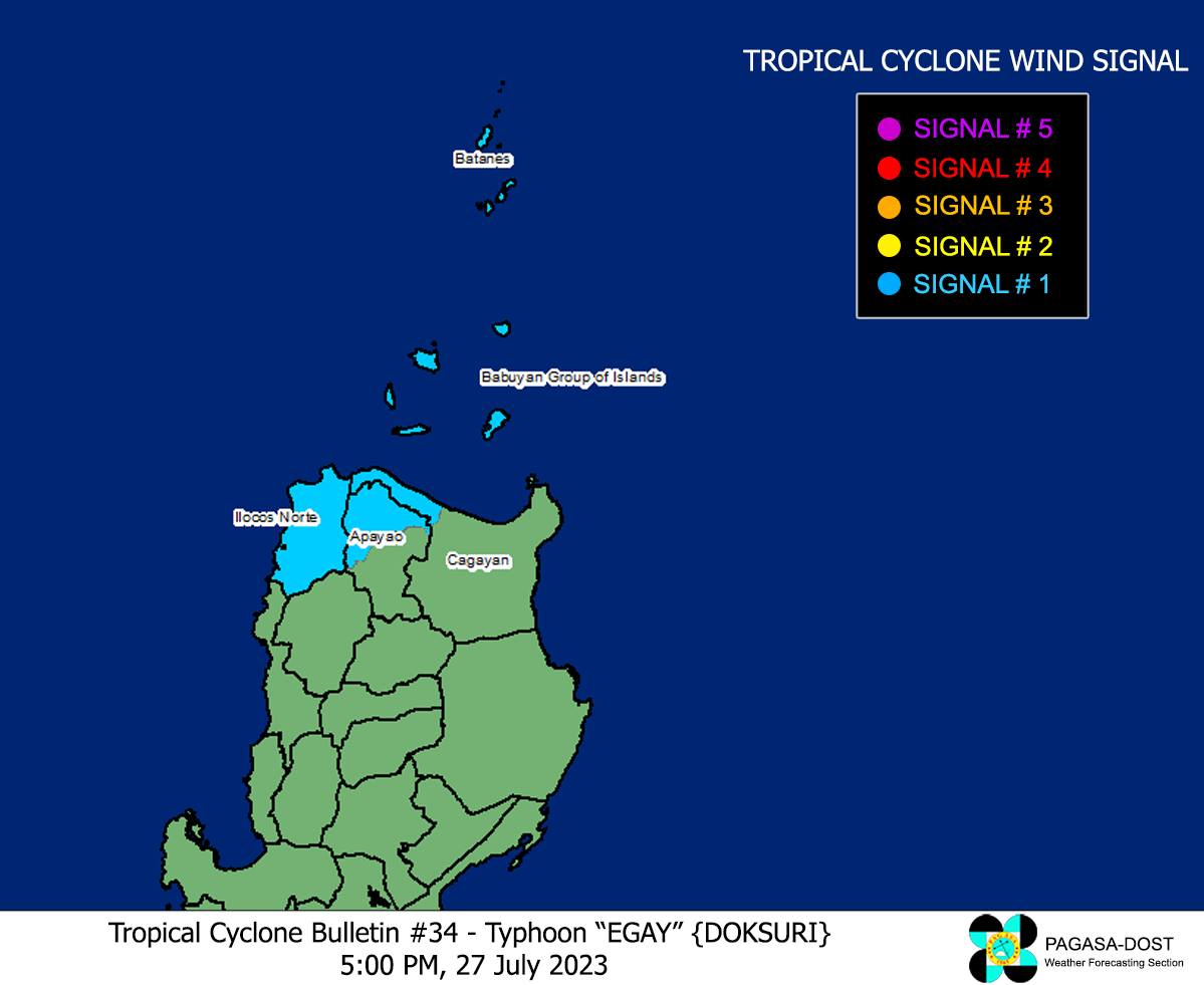 At 4:00 PM, the center of Typhoon Egay was located 280 km West Northwest of Itbayat, Batanes, outside the Philippine Area of Responsibility (PAR). The typhoon maintains its intensity with maximum sustained winds of 150 km/h near the center and gusts of up to 185 km/h, accompanied by a central pressure of 955 hPa.