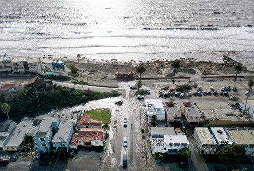 APTOS, CALIFORNIA - JANUARY 10: In an aerial view, vehicles pass drive along a flooded street close to the beach on January 10, 2022 in Aptos, California. The San Francisco Bay Area and much of Northern California continue to get drenched by powerful atmospheric river events that have brought high winds and flooding rains. The storms have toppled trees, flooded roads and cut power to tens of thousands. Storms are lined up over the Pacific Ocean and are expected to bring more rain and wind through the end of the week. Mario Tama/Getty Images/AFP