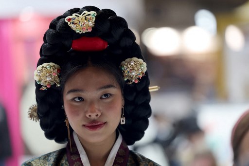 A South Korean woman in traditional clothes attends on the opening day of the 2023 International Tourism Fair (FITUR) held at the Ifema congress centre in Madrid on January 18, 2023. Pierre-Philippe Marcou / AFP