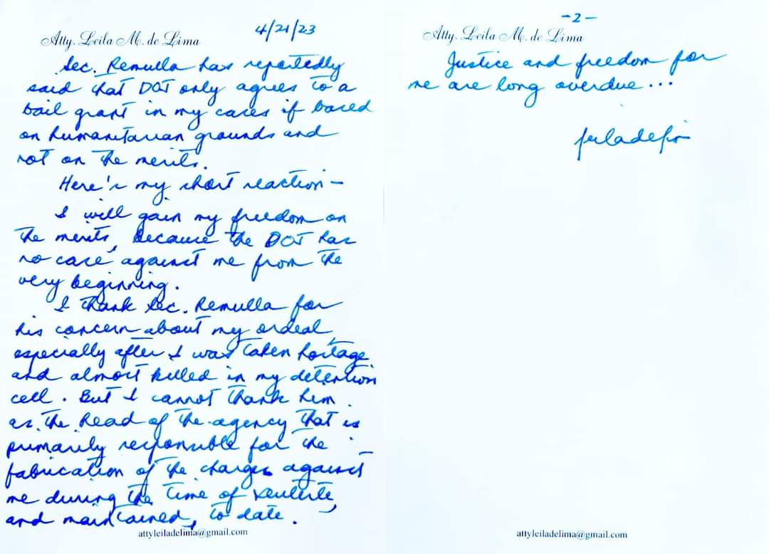 In a recent dispatch from Crame, Atty. Leila M. de Lima has responded to the remarks made by the Secretary of Justice, Remulla, regarding her petition for bail. According to reports, Remulla stated that the Department of Justice would only grant bail in de Lima's cases if it were based on humanitarian grounds, and not on the merits of the case.