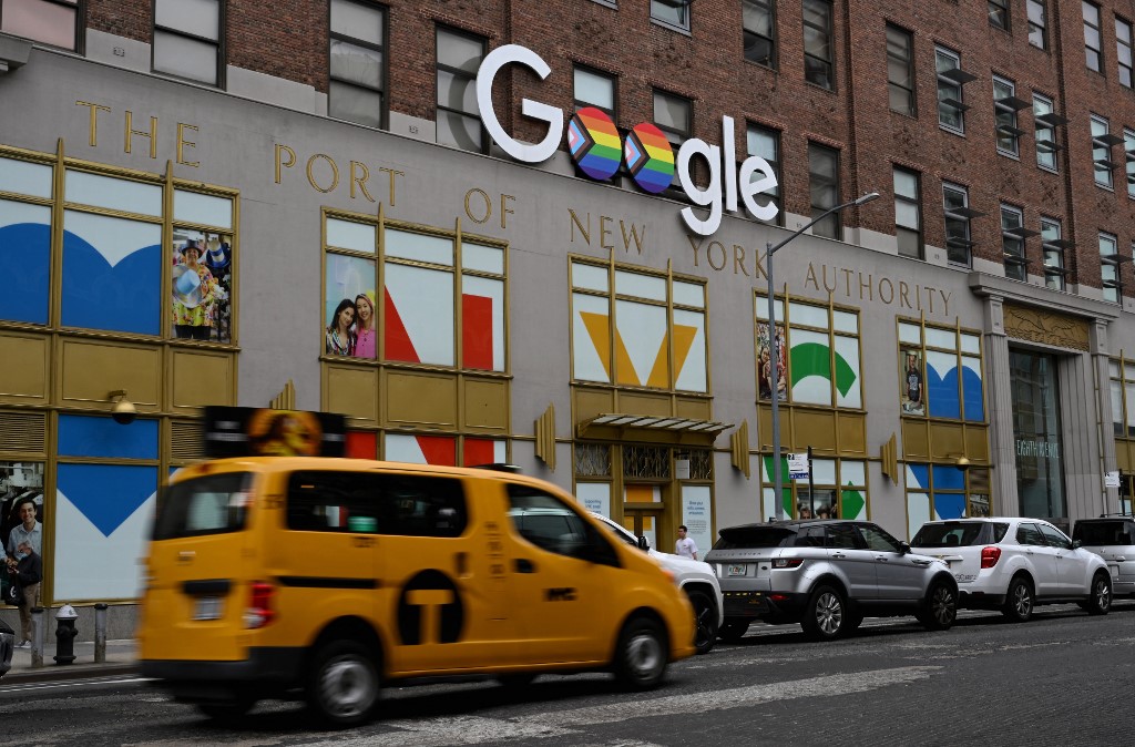(FILES) In this file photo taken on June 07, 2022, the Google logo with the rainbow flag as a symbol of lesbian, gay, bisexual, transgender (LGBT) and queer pride and LGBT social movements in New York City. Google's parent company Alphabet announced about 12,000 job cuts globally on January 20, 2023, citing a changing "economic reality", becoming the latest US tech giant to enact large-scale restructuring. The layoffs come a day after Microsoft said it would reduce staff numbers by 10,000 in the coming months, following similar cuts by Facebook owner Meta, Amazon and Twitter as the previously unassailable tech sector battles a major economic downturn. Angela Weiss / AFP