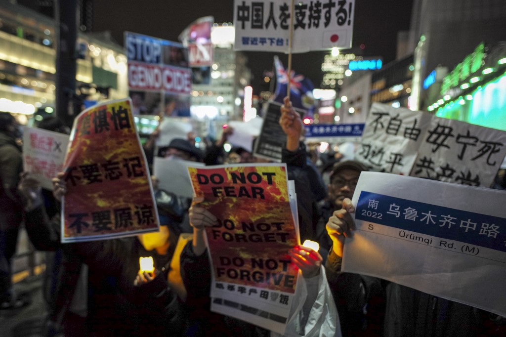 FILE. Chinese residents in Japan and supporters stage a rally to protest against China's zero-Covid policy and the dictatorial rule of the Chinese Communist Party in Tokyo on November 30, 2022 as part of candlelight vigil for victims of the deadly November 24 fire in the Chinese city of Urumqi. Kazuhiro NOGI / AFP