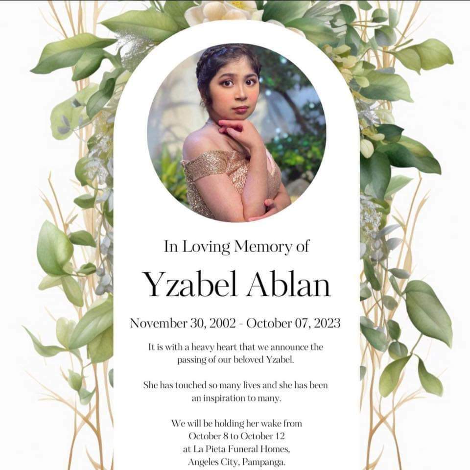 A wake for Yzabel will be held at La Pieta Funeral Homes in Angeles, Pampanga, from October 8 to October 12.