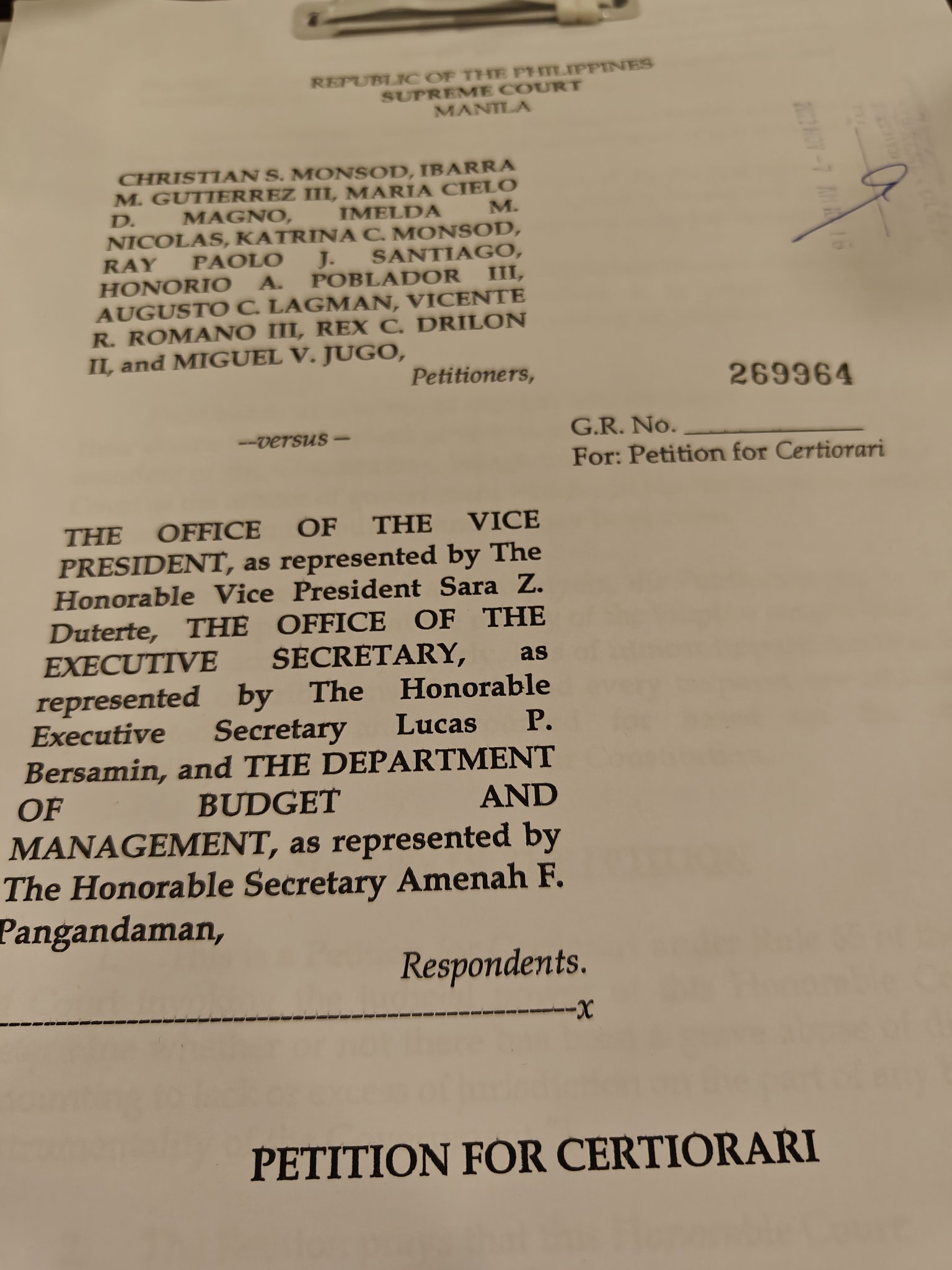 The petitioners, including Christian S. Monsod, Ibarra M. Gutierrez III, Maria Cielo D. Magno, Imelda M. Nicolas, Katrina C. Monsod, Ray Paolo J. Santiago, Honorio A. Poblador III, Augusto C. Lagman, Vicente R. Romano III, Rex C. Drilon II, and Miguel V. Jugo, are challenging the Office of the Vice President, represented by Vice President Sara Z. Duterte, the Office of the Executive Secretary, represented by Executive Secretary Lucas P. Bersamin, and the Department of Budget and Management, represented by Secretary Amenah F. Pangandaman.