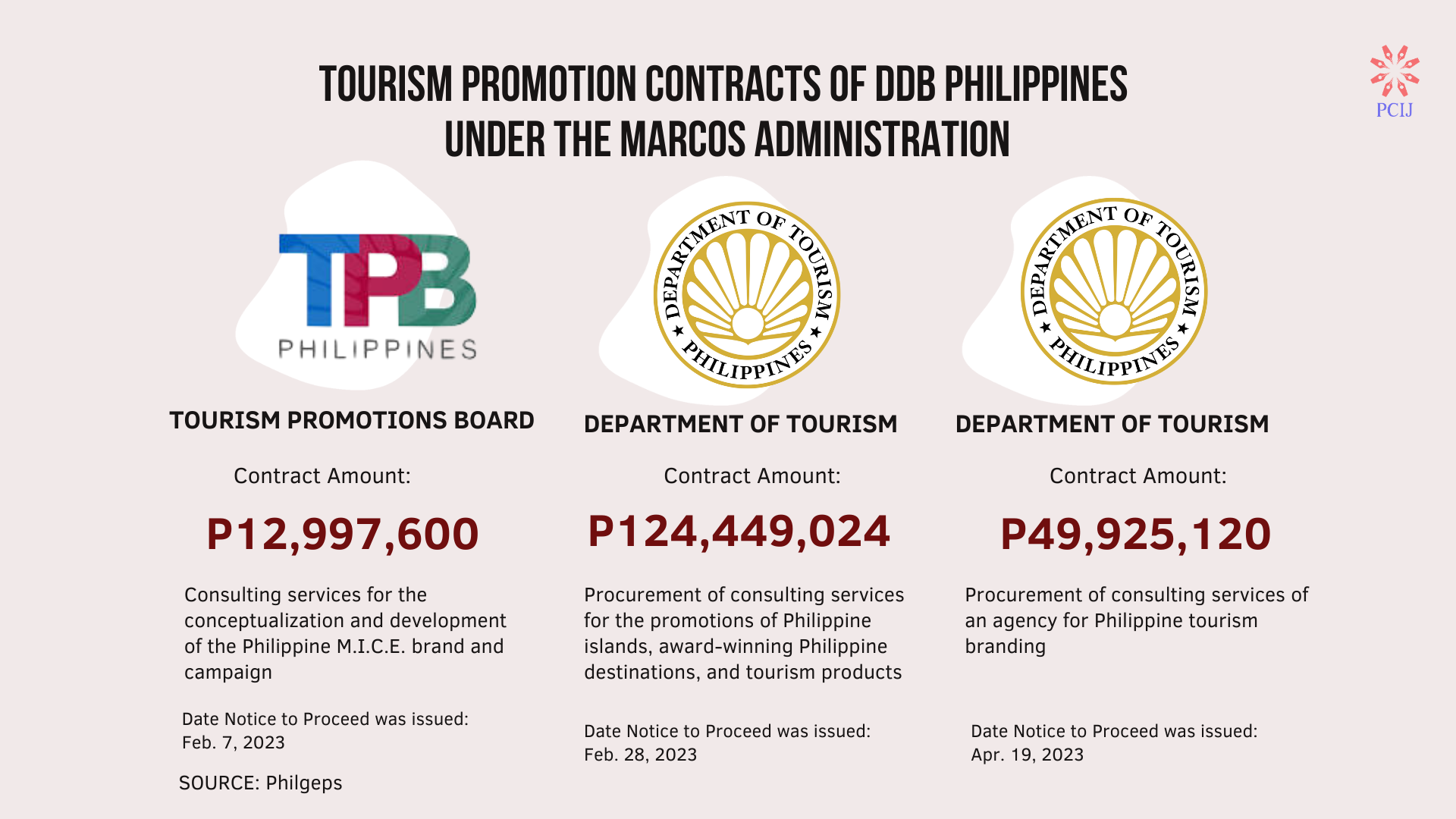 DDB Philippines got a P124.45-million contract with the Department of Tourism (DOT) in February this year, and sealed the P12.99-million contract with the Tourism Promotions Board (TPB) in December last year, based on documents PCIJ obtained from the Philippine Government Electronic Procurement System (Philgeps).