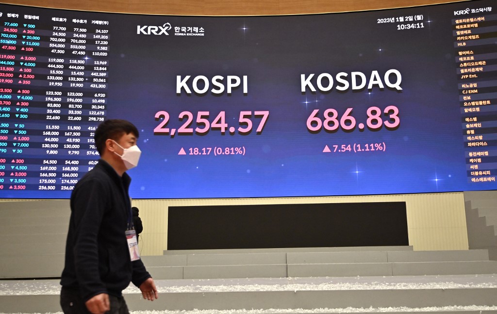 A man walks past a stock index board showing South Korea's benchmark stock index (C) after a ceremony celebrating the New Year's opening of the South Korea stock market at the Korea Exchange in Seoul on January 2, 2023. Jung Yeon-je / AFP