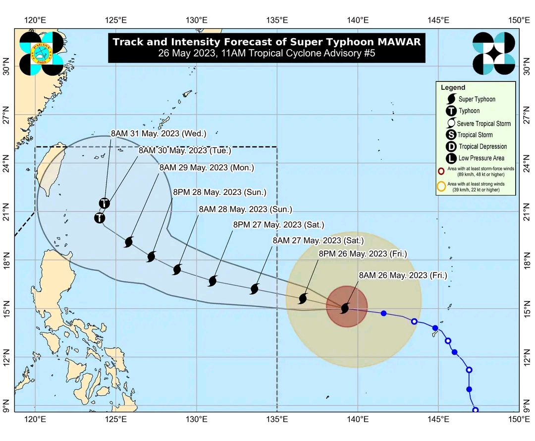 The Philippine Atmospheric, Geophysical, and Astronomical Services Administration (PAGASA) has released Tropical Cyclone Advisory No. 5, providing updates on Super Typhoon "Mawar" as it continues to progress westward over the Philippine Sea.