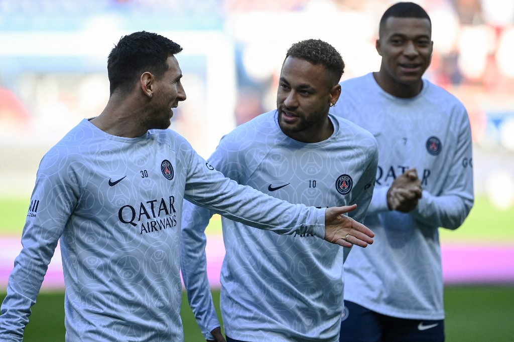 Paris Saint-Germain's Argentine forward Lionel Messi (L), Paris Saint-Germain's Brazilian forward Neymar (C) and Paris Saint-Germain's French forward Kylian Mbappe discuss as they warm up prior to the French L1 football match between Paris Saint-Germain FC and AJ Auxerre at the Parc des Princes stadium in Paris on November 13, 2022. FRANCK FIFE / AFP