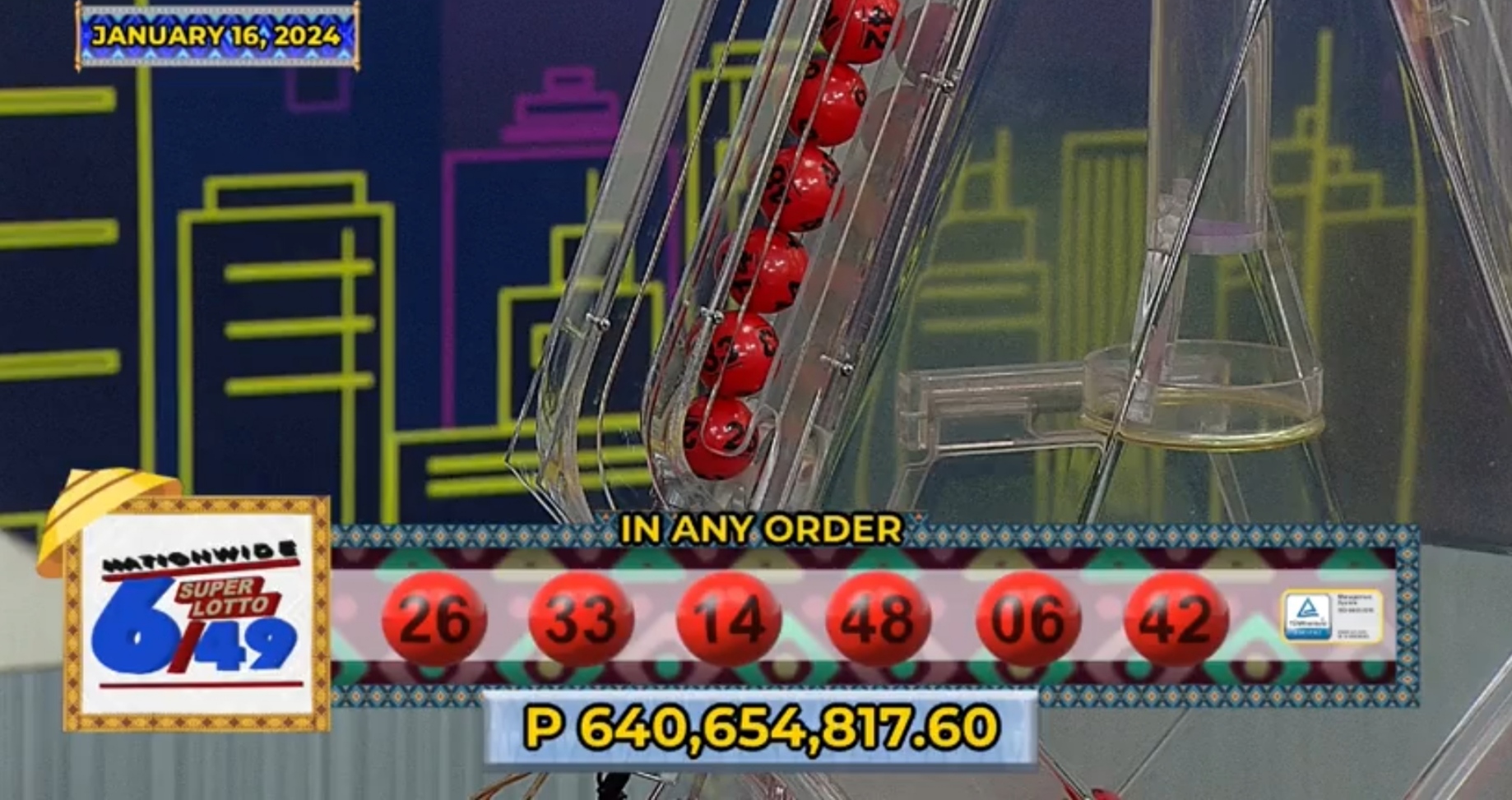 A lone bettor successfully clinched the jackpot in the Lotto 6/49 draw held on January 16, 2024. The winning combination, which secured the prize of P640,654,817.60, consisted of the numbers 26-33-14-48-06-42.