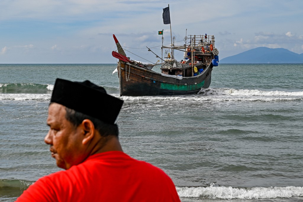 A man stands near a boat used by Rohingya refugees to arrive in Lamnga beach, Aceh province on January 8, 2023. A wooden boat carrying nearly 200 Rohingya refugees, a majority of them women and children, landed on Indonesia's western coast on January 8, police said. Chaideer MAHYUDDIN / AFP