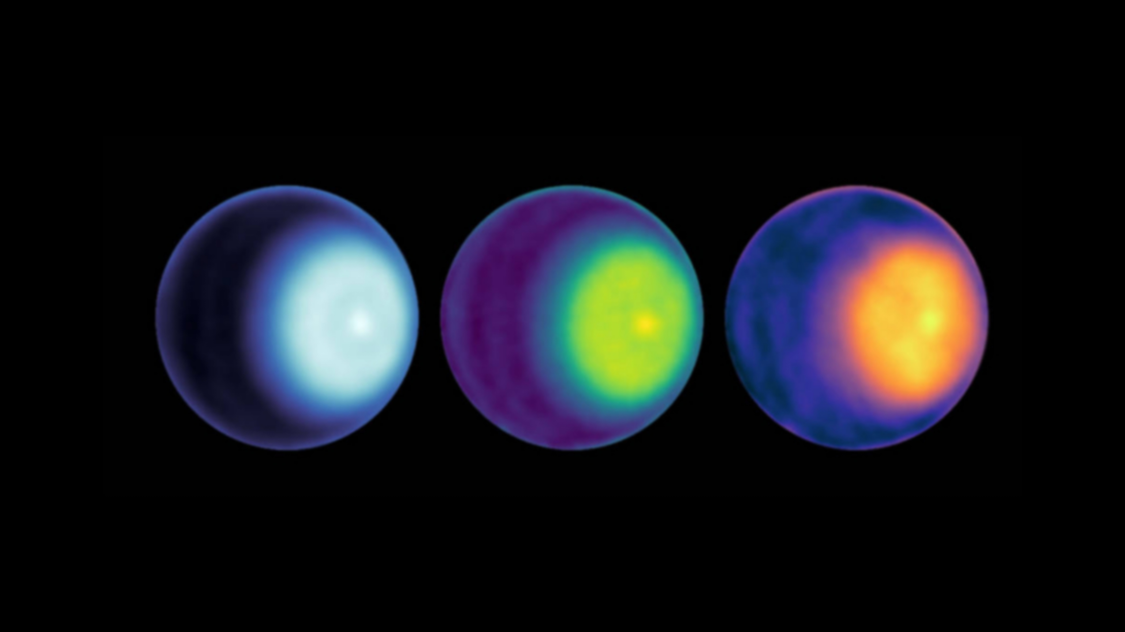 NASA scientists used microwave observations to spot the first polar cyclone on Uranus, seen here as a light-colored dot to the right of center in each image of the planet. The images use wavelength bands K, Ka, and Q, from left. To highlight cyclone features, a different color map was used for each. Credits: NASA/JPL-Caltech/VLA