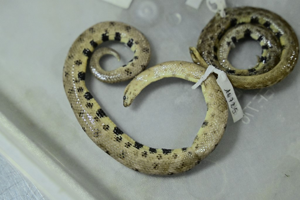 A specimen of a new species of dwarf boa, "Tropidophis cacuangoae," is seen at a laboratory of the National Institute of Biodiversity INABIO in Quito on January 5, 2023. Rodrigo BUENDIA / AFP