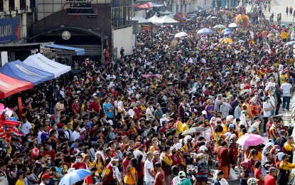 SEA OF DEVOTEES. Hundreds of devotees gather in front of the Quiapo Church to join the celebration of the Feast of the Black Nazarene along Quezon Boulevard in Quiapo, Manila Monday (Jan. 9, 2023). The Traslacion (transfer) was canceled for the third straight year but their devotion to the Black Nazarene never wavered. (PNA photo by Joey O. Razon)