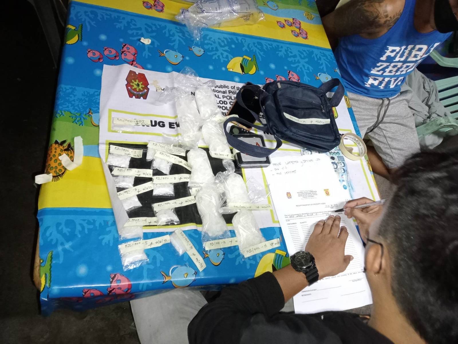 Law enforcement officials recovered a substantial amount of evidence at the scene. The confiscated items include one (1) large heat-sealed transparent plastic sachet containing a white crystalline substance suspected to be shabu (the buy-bust item), ten (10) large heat-sealed transparent plastic sachets containing a white crystalline substance suspected to be shabu (possession), seven (7) knot-tied transparent plastic sachets containing a white crystalline substance suspected to be shabu (possession), one (1) digital weighing scale, one (1) blue sling bag, and three (3) genuine one thousand peso bills (the buy-bust money).
