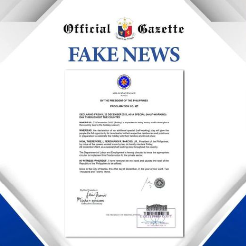 The Presidential Communications Office has officially confirmed that the circulating "Proclamation No. 427," declaring December 22, 2023, as a special (half-working) day, is entirely false. The document in question is counterfeit and lacks official government verification.