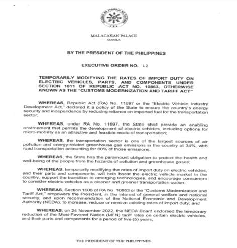 Marcos on Jan. 13 inked Executive Order (EO) 12 after the National Economic and Development Authority (NEDA) Board on Nov. 24, 2022 endorsed the temporary reduction of the Most-Favored Nation (MFN) tariff rates on certain EVs and their parts and components for five years.