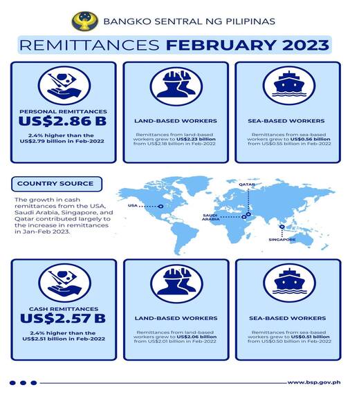 Overseas Filipinos (OFs) continue to send money back home, as personal remittances rose by 2.4 percent to US$2.86 billion in February 2023, compared to US$2.79 billion in the same month last year. This increase was attributed to higher remittances from land-based workers with work contracts of one year or more, as well as sea- and land-based workers with work contracts of less than one year, according to the latest data released by the Philippine central bank.