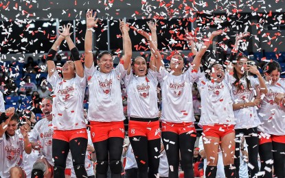 TEAM TO BEAT. The Petro Gazz Angels celebrate their Premier Volleyball League (PVL) Reinforced Conference title in 2022. Petro Gazz remains the team to beat as it battles Creamline in the opener of the All-Filipino conference at the Smart Araneta Coliseum in Quezon City on Saturday (Feb. 4, 2023). (Photo courtesy of PVL)