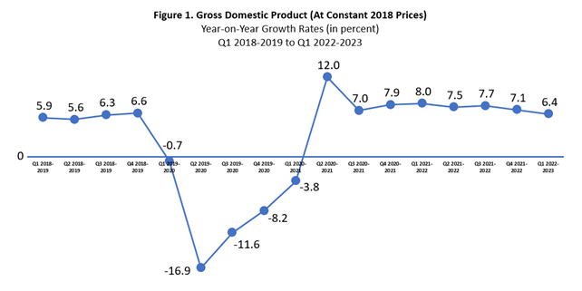 In a positive development for the Philippine economy, the country's Gross Domestic Product (GDP) grew by 6.4 percent in the first quarter of 2023, according to the latest data released by the Philippine Statistics Authority. This marks the lowest growth rate after seven quarters of economic recovery since the pandemic began in the second quarter of 2021.