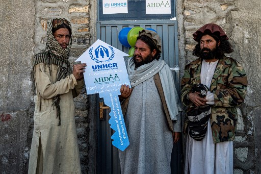 In this photo taken on December 15,2022, Afghan villagers attend a handover ceremony of newly built houses constructed by the United Nations refugee agency (UNHCR) in Barmal district, Paktika province. More than 1,000 people were killed and tens of thousands made homeless after the 5.9-magnitude quake -- the deadliest in Afghanistan in nearly a quarter of a century -- struck the impoverished province of Paktika on June 22.