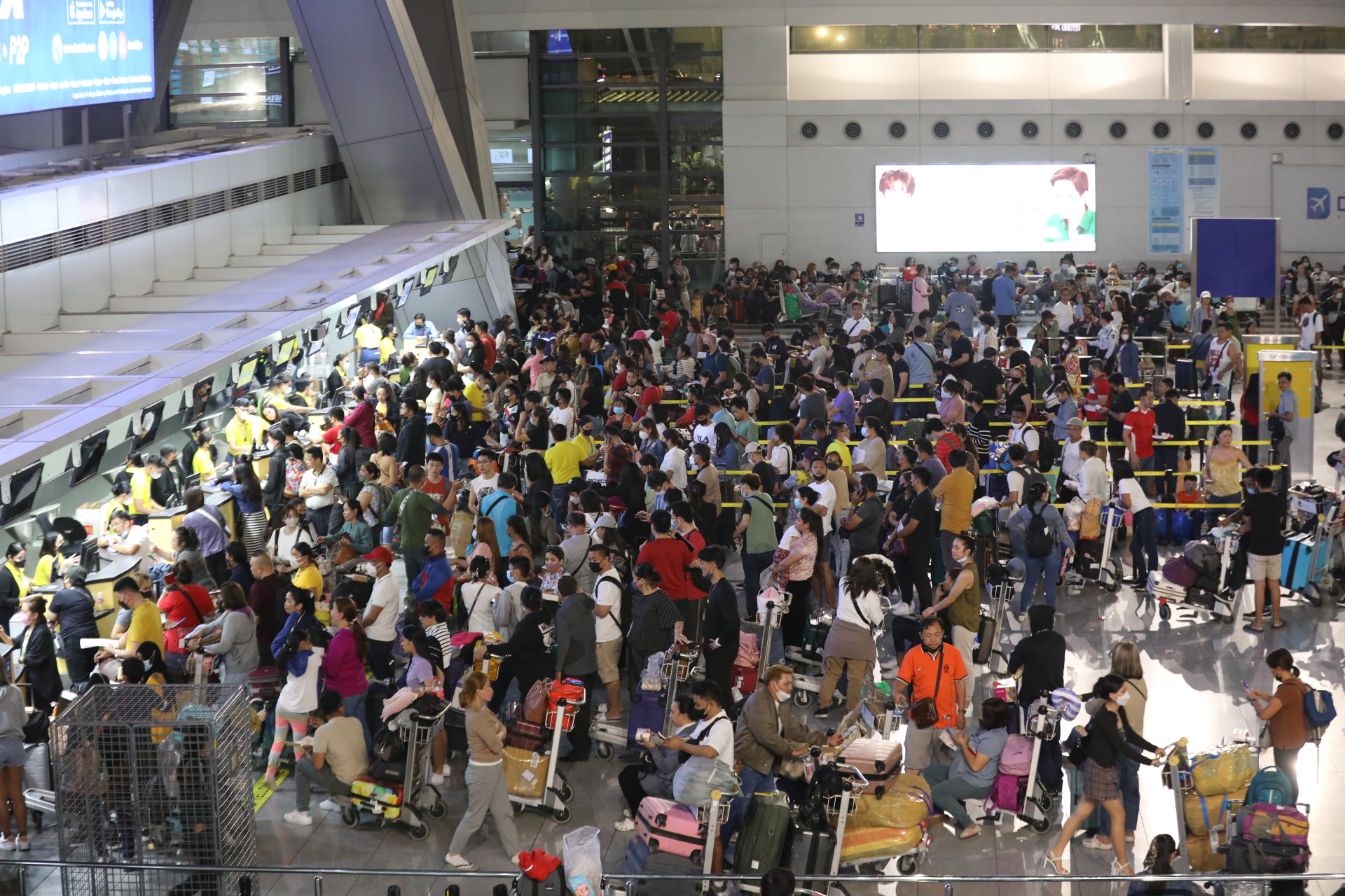OFF TO A WRONG START. Stranded passengers await their fate at the Ninoy Aquino International Airport Terminal 3 in Pasay City on Sunday (Jan. 1, 2023). About 280 inbound and outbound flights were put on hold due to technical glitches, according to the Civil Aviation Authority of the Philippines. (PNA photo by Avito Dalan)