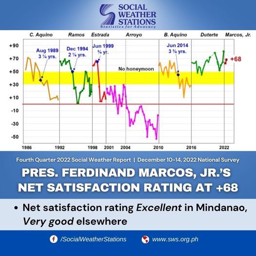 The net satisfaction rating for PBBM meanwhile was found to be at a very good +68. The resulting net satisfaction rating of +68 was classified by SWS as very good, and marks a 5-point increase from the +63 net satisfaction rating in October 2022.