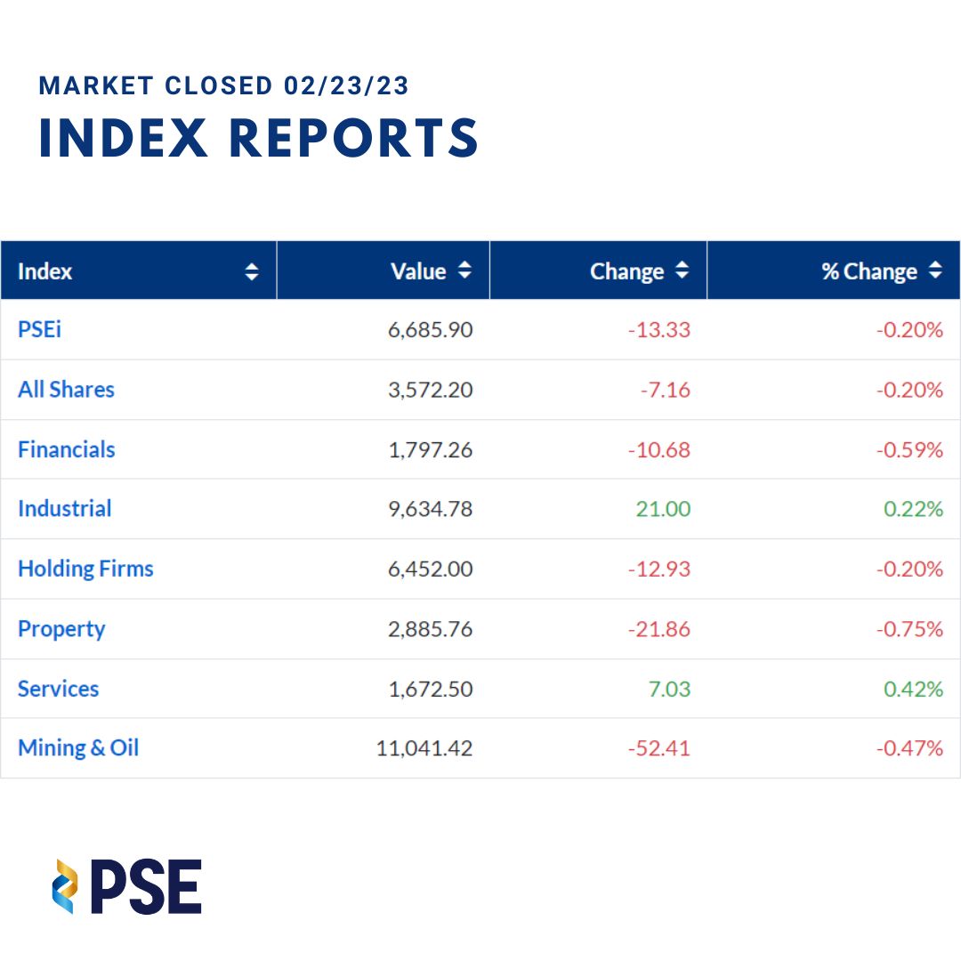 The PSEi ended the day at 6,685.90, down 13.33 points or 0.20 percent from the previous day's close. The market's total value for the day was PHP 4.3 billion, with 85 advances, 90 declines, and 39 unchanged.