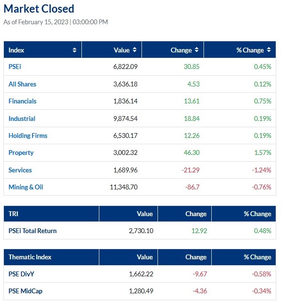 The Philippine Stock Exchange Index (PSEi) closed higher on Tuesday, February 15, 2023. The benchmark index gained 30.85 points or 0.45 percent to finish at 6,822.09.