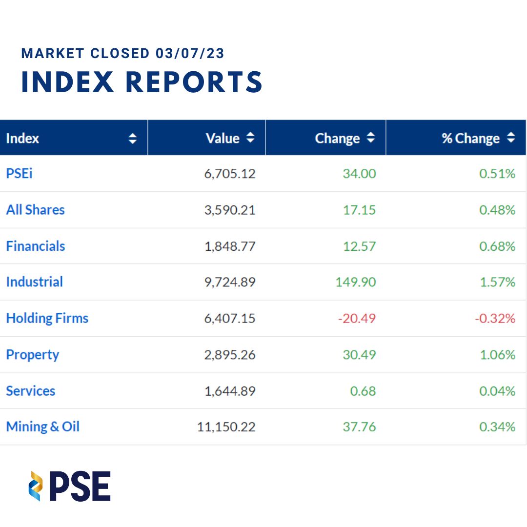 The Philippine Stock Exchange Index (PSEi) closed on March 7, 2023, at 6,705.12, up by 34.00 points or 0.51 percent, according to the PSE website.
