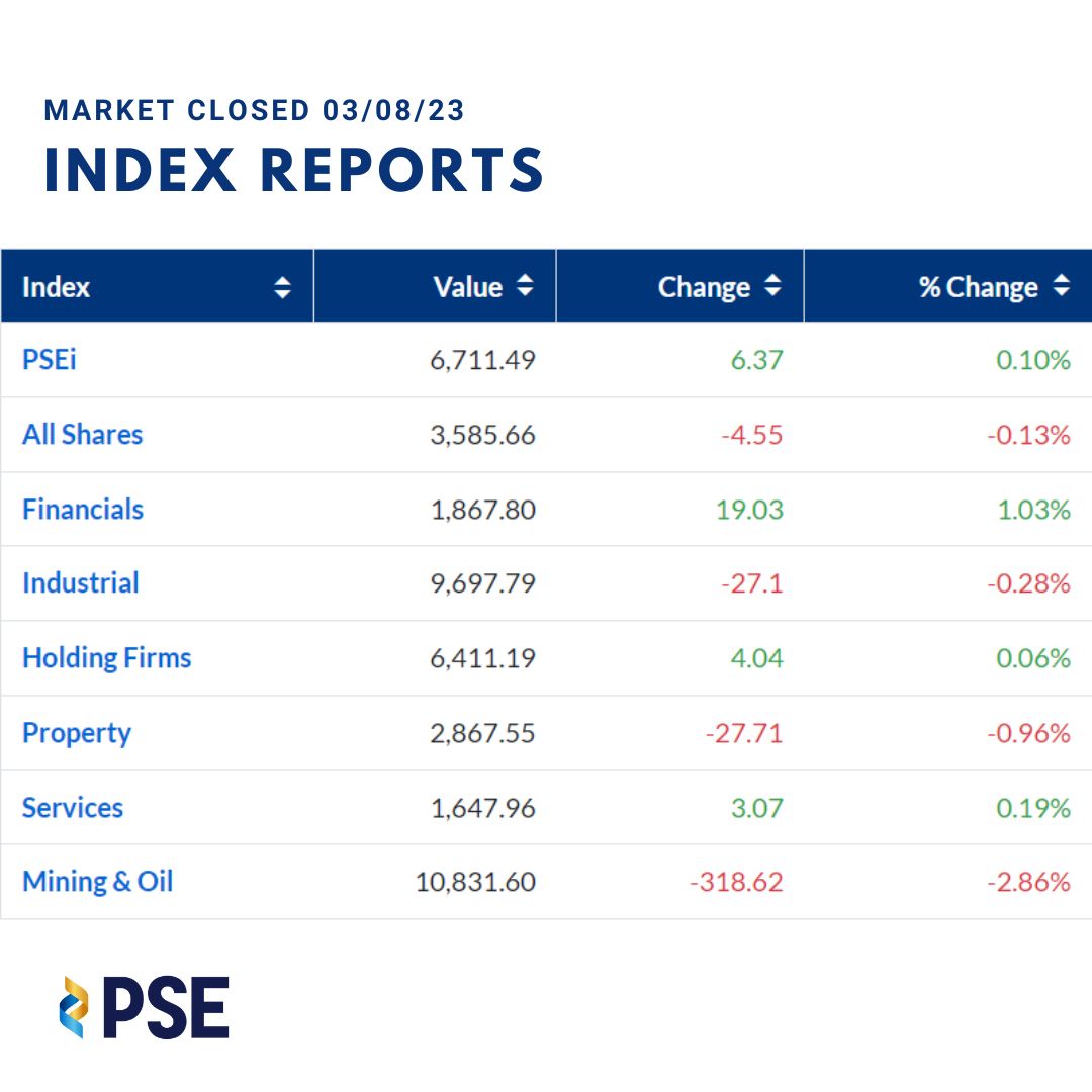 The Philippine Stock Exchange Index (PSEi) closed at 6,711.49, up 6.37 points or 0.10 percent.