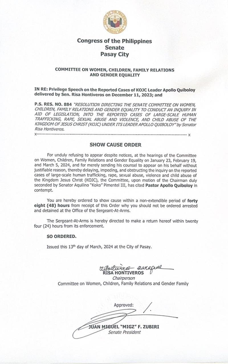The Committee on Women, Children, Family Relations, and Gender Equality, led by Chairperson Sen. Risa Hontiveros, has cited Pastor Apollo Quiboloy, leader of the Kingdom of Jesus Christ (KOJC), in contempt.