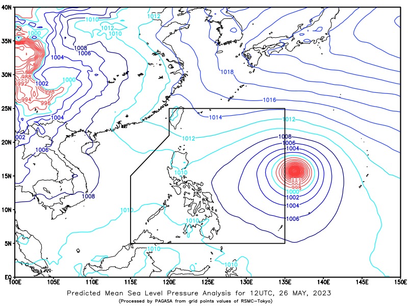 Additionally, a tropical cyclone named Super Typhoon Mawar was located approximately 1,725 kilometers east of Central Luzon, with maximum sustained winds of 215 km/h near the center and gustiness of up to 265 km/h. The typhoon is moving west northwestward at a speed of 25 km/h.