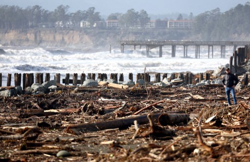 APTOS, CALIFORNIA - JANUARY 10: A person stands amid storm debris washed up on the beach on January 10, 2022 in Aptos, California. The San Francisco Bay Area and much of Northern California continues to get drenched by powerful atmospheric river events that have brought high winds and flooding rains. The storms have toppled trees, flooded roads and cut power to tens of thousands. Storms are lined up over the Pacific Ocean and are expected to bring more rain and wind through the end of the week. Mario Tama/Getty Images/AFP