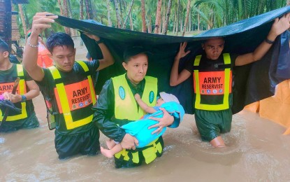 EVACUATION. Personnel from the 1501st Community Defense Center of the Army's 1501st Ready Reserve Infantry Battalion conducts a rescue operation for residents affected by flooding on Tuesday (Jan. 10, 2023) in Barangay Libertad, Butuan City. At least 269 families or 1,237 individuals have so far been evacuated to six temporary shelters. (Photo courtesy of 1501st Community Defense Center)
