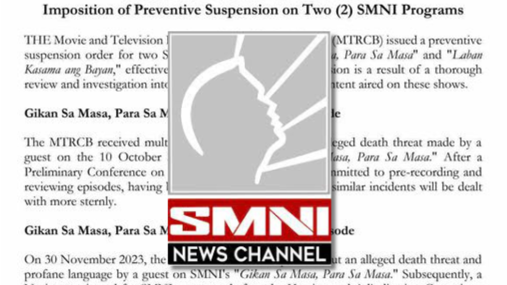 The Movie and Television Review and Classification Board (MTRCB) has taken decisive action by issuing a preventive suspension order for two prominent SMNI programs, "Gikan Sa Masa, Para Sa Masa" and "Laban Kasama ang Bayan." The suspension, effective from December 18, 2023, comes in the wake of a thorough review and investigation into alleged violations related to the content aired on these shows.