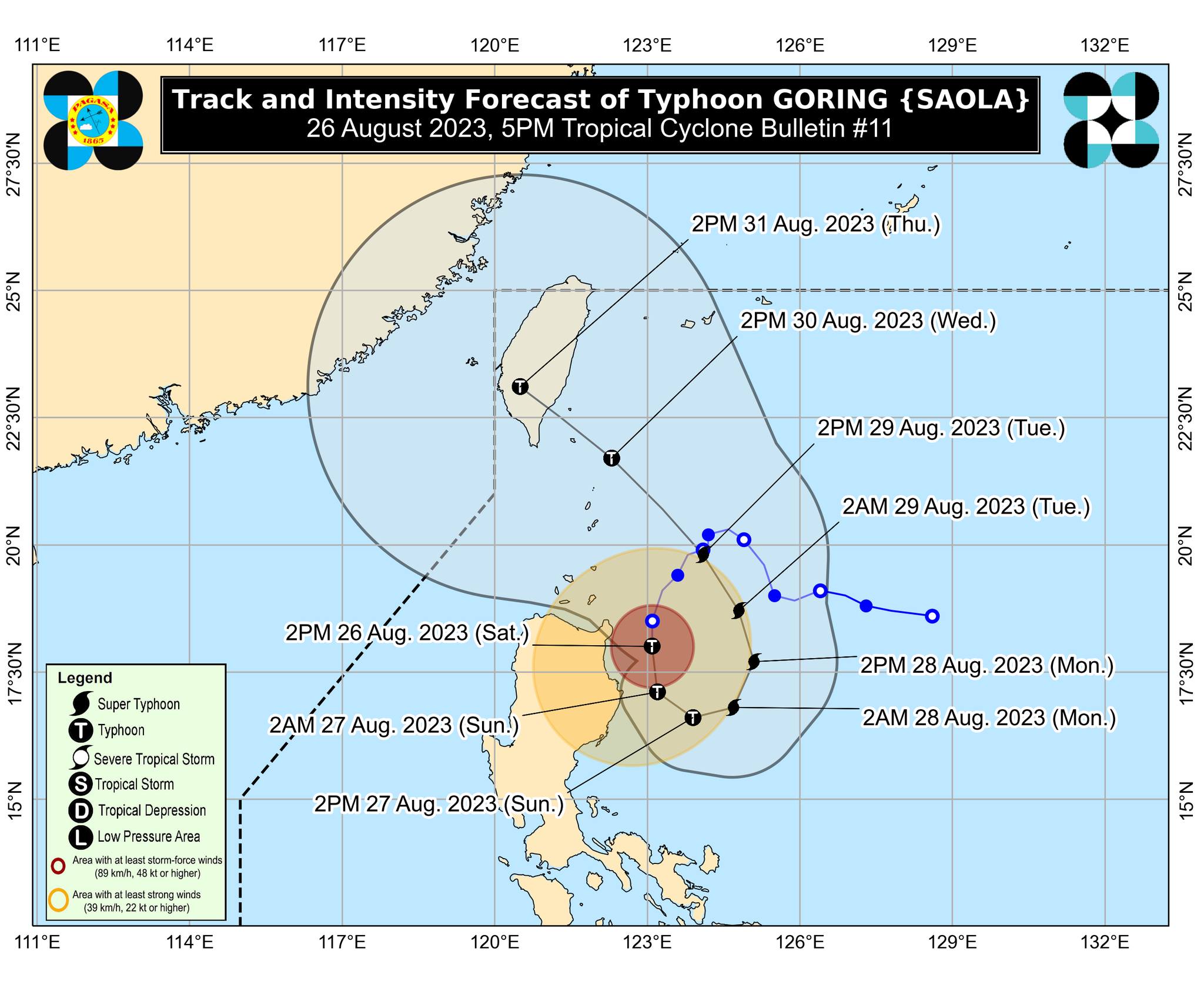 The forecast suggests that due to favorable environmental conditions, Typhoon GORING will likely continue to intensify, possibly reaching super typhoon category on Monday. However, the process might be curbed by the upwelling of cooler waters due to the typhoon's slow movement, possibly limiting further intensification by late Monday (August 28,2023) or early Tuesday (August 29,2023). Residents and authorities are advised to stay vigilant and take necessary precautions to ensure safety during this critical weather event.