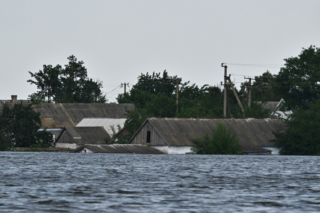 House are flooded in the village of Afanasiyivka, Mykolaiv region on June 9, 2023, after water level in the Ingulets river increased following damages sustained at Kakhovka hydroelectric power plant dam. Ukraine and Russia accused each other of shelling in the flood hit Kherson region even as rescuers raced to save people stranded after the destruction of a Russian-held dam flooded towns and villages along the banks of the Dnipro river, including neighbourhoods of the regional capital Kherson, forcing thousands of people to evacuate their homes. Genya SAVILOV / AFP