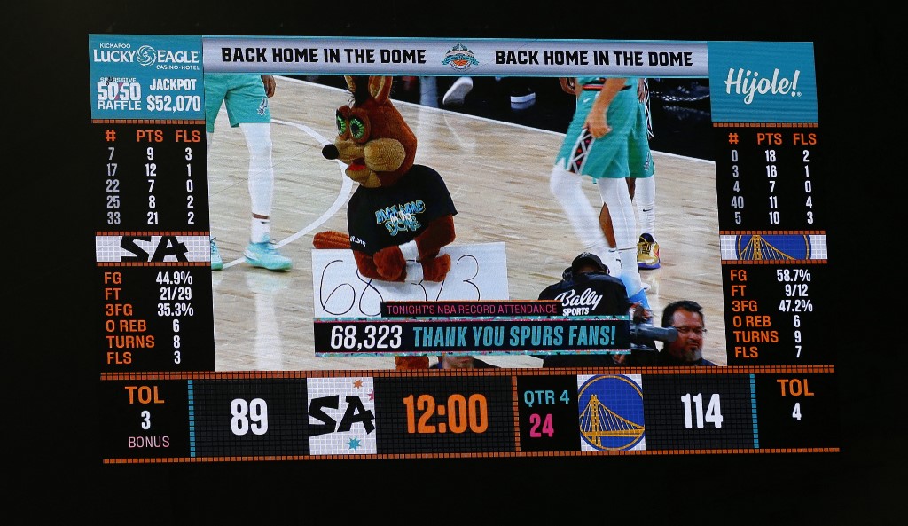 SAN ANTONIO, TX - JANUARY 13: The record attendance of 68,323 is announced at the end of the third quarter during the game between the Golden State Warriors and the San Antonio Spurs at the Alamodome on January 13, 2023 in San Antonio, Texas. Ronald Cortes/Getty Images/AFP