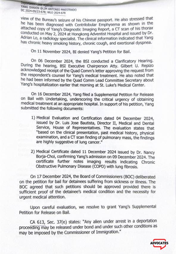 However, documents obtained independently by Advocates confirm that the recommendation was made by Atty. Gilberto U. Repizo, chairman of the BI’s Board of Special Inquiry (BSI).