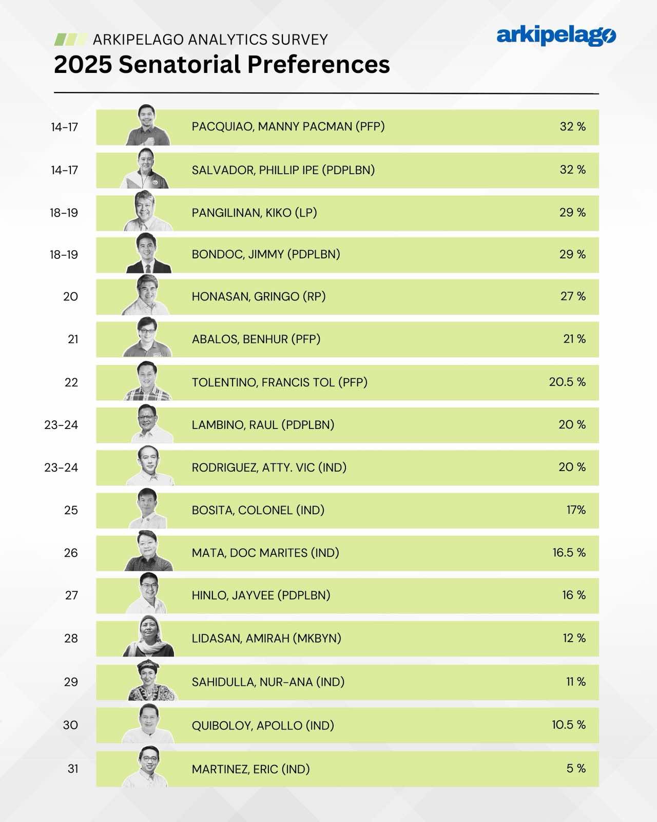 Outside the top ten, Rodante Marcoleta (34%), Bam Aquino (33.5%), and Imee Marcos (33%) are still in striking distance. Meanwhile, familiar names like Abby Binay, Ping Lacson, Manny Pacquiao, and Phillip Salvador are all hovering around the 32% mark.